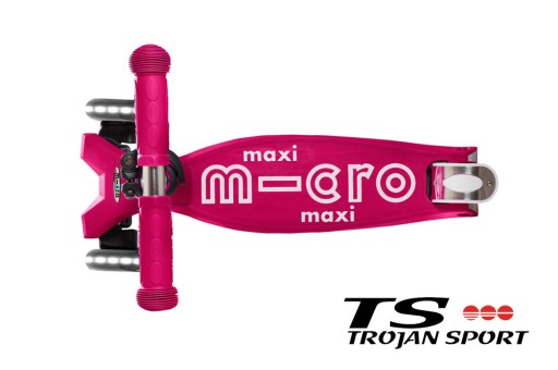 Hulajnoga Maxi Micro Deluxe to ulepszona wersja bestsellera Maxi renomowanej szwajcarskiej firmy Micro. W wersji Deluxe LED zyskała świecące przednie koła. Specjalny, wzmocniony podest wytrzymuje teraz bez problemu aż do 70 kg. Tak więc jest to optymalne rozwiązanie dla dzieci za dużych na Mini Micro i tych, którzy z Mini Micro wyrastają i chcą hulajnogi "na lata". Maxi podobnie jak Micro dostępna jest w szerokiej gamie kolorystycznej. Pomysł, żeby umieścić dwa kółka z przodu pojazdu, a podest zawiesić blisko ziemi, sprawia, że Maxi Micro Deluxe jest wyjątkowo stabilna i bezpieczna dla dziecka. Unikalny mechanizm skręcania pomaga wykształcić zmysł równowagi u dzieci i uczy balansowania ciałem. Główna różnica w porównaniu z "klasycznym" modelem Mini Micro to regulowana kierownica.