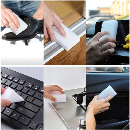 Bez chemii - tylko odrobina wody! Magiczne gąbki nie wymagają dodatkowego użycia środków czystości. Wystarczy je namoczyć i zacząć sprzątać. Idealna do: łazienki pozwoli usunąć osad z mydła w wannie, w kabinie prysznicowej kuchni przy czyszczeniu zlewu, okapu, szafek kuchennych na których codziennie znajdują się tłuste plamy czyszczenia fug czyszczenia eko skóry czyszczenia plastiku – m.in. drukarek, obudowy komputera czy klawiatury tapicerki samochodowej, kokpitu, skór UWAGA Gąbkę trzeba zawsze testować w niewidocznym miejscu, aby sprawdzić czy nie zniszczy czyszczonej powierzchni. Ze względu na specjalną strukturę gąbki, nie należy jej po zamoczeniu wyżymać czy skręcać! Gąbkę ściskamy równomiernie dwiema dłońmi aby usunąć wodę.