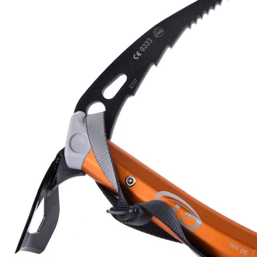Istnieje też możliwość zamontowania wspornika, który zapewni skuteczne oparcie dłoni i zapobiegnie jej przypadkowemu zsunięciu się w najmniej oczekiwanym momencie. Ostrze czekana wykonano ze stali hartowanej, która charakteryzuje się wysoką wytrzymałością – świetnie się sprawdza w zmrożonym śniegu. Dodatkowe ząbki oferują optymalne trzymanie. Z kolei łopatka pozwala szybko i skutecznie oczyszczać chwyty, a także wyrąbywać stopnie w lodzie. Odpowiedni kształt głowicy sprawia, że całość pewnie leży w dłoni. Lekko zakrzywione stylisko umożliwia komfortowe podpieranie się czekanem na mniej stromych fragmentach, jak również wygodny zamach do osadzenia ostrza w lodzie.