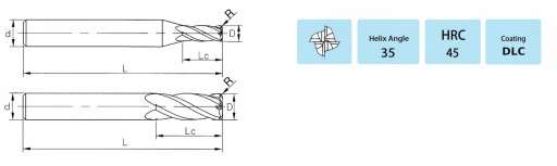 Frez węglikowy VHM Promieniowy do Aluminium 4 - ostrzowy / 4 - piórowy. Fi. 2 mm R - 0,2 mm - 45 HRC.