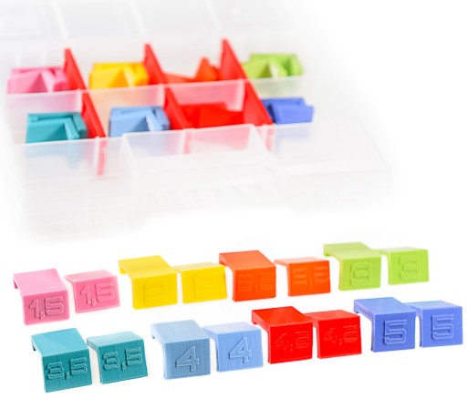 Organizer oraz zestaw różnokolorowych, drukowanych dystansów, ułatwiających regulację frontów.