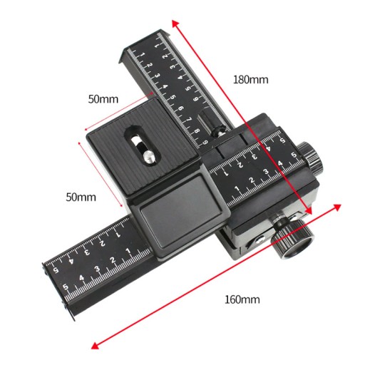 Każda z suwnic posiada skalę z podziałką w milimetrach. Wolny ruch pokrętłami pozwala przesuwać aparat o dziesiąte części milimetra, co nie jest możliwe przy pomocy zwykłej głowicy lub trzymając aparat w ręku.