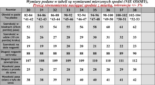 - Spodnie po przymierzeniu powinny być raczej "na ciasno" gdyż nowe spodnie mają tendencję do rozbijania (rozciągania) się po chwili używania o pół nawet do jednego rozmiaru.