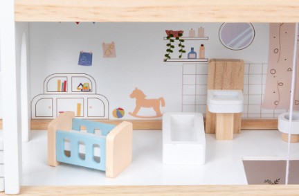 Szkielet domku dla lalek wykonany jest w większości z drewna, z dbałością o wszelkie detale. Elementy dołączone do zestawu urozmaicają zabawę.