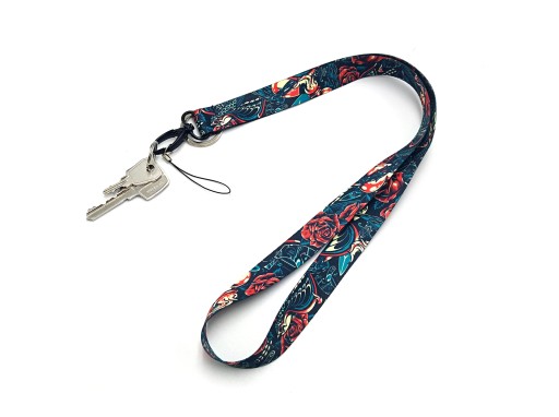 Smycz z nadrukiem we wzór tatuaży o szerokości 20mm z metalowym czarnym karabińczykiem do kluczy