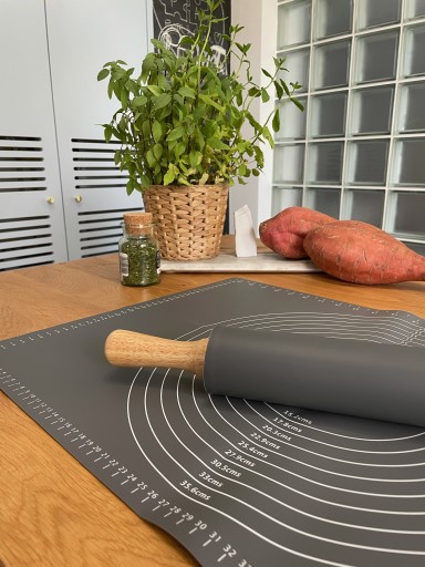Stolnica idealnie przylega do stołu lub blatu. Górna powierzchnia wykonana została z porowatej struktury co zapobiega przywieraniu ciasta. Stolnica posiada również przydatne okręgi z wpisaną średnicą oraz boczne miarki. W zestawie znajduje się funkcjonalny, silikonowy wałek do ciasta z drewnianymi uchwytami, który nie nasiąka płynami i zapachami ale przede wszystkim nie klei się do ciasta.