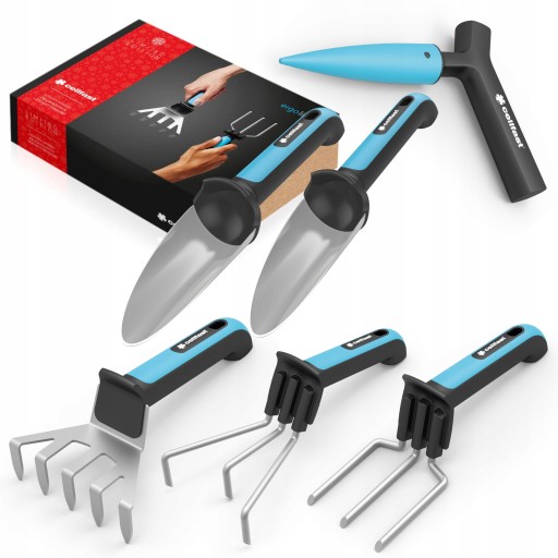 zestaw zawiera pełną gamę narzędzi pielęgnacyjnych ERGO LINE: łopatkę wąską i szeroką, widełki, kultywator, grabki i pikownik do zestawu dołączono również rękawice ogrodowe