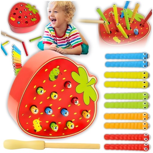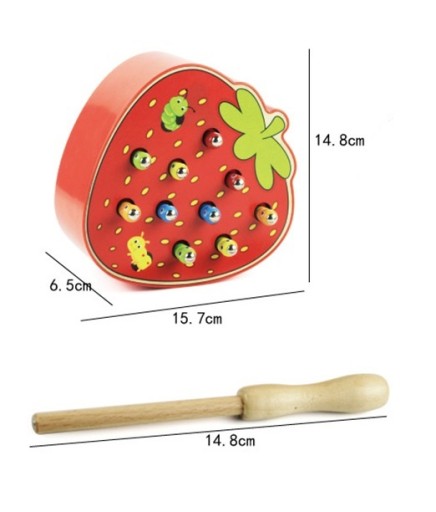 ZŁAP ROBACZKA — drewniana zabawka zręcznościowa truskawka to doskonały pomysł na zajęcie malucha.