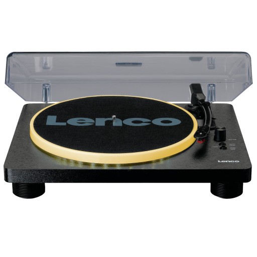 Gramofon Lenco LS-50LEDBLK posiada wyjątkowe, kolorowe podświetlenie LED talerza, które może zmieniać barwę w rytm muzyki, automatycznie zanikać, podświetlać talerz stale w wybranym kolorze lub być wyłączone.
