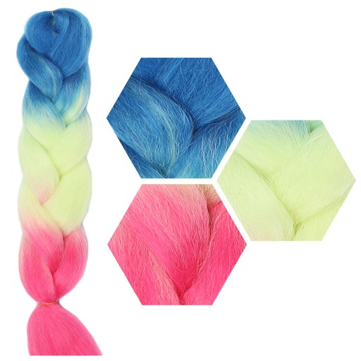 Włosy syntetyczne w przepięknym wariancie kolorystycznym - niebiesko-żółto-różowym. Wykonane z puszystego poliestru.