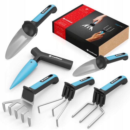 zestaw zawiera pełną gamę narzędzi pielęgnacyjnych ERGO LINE: łopatkę wąską i szeroką, widełki, kultywator, grabki i pikownik do zestawu dołączono również rękawice ogrodowe