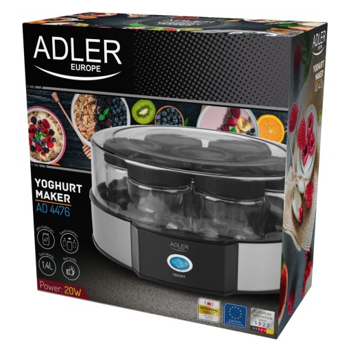 Do produkcji świeżego, zdrowego jogurtu wystarczą 3 rzeczy: mleko, kultury bakterii oraz jogurtownica Adler AD 4476. Urządzenie powala przygotować jogurt w niesamowicie prosty sposób. Po umieszczeniu składników reszta procesu przebiega automatycznie, bez udziału użytkownika. Jogurt powstaje od razu w szklanych słoiczkach o pojemności 200ml każdy, co ułatwia późniejsze wygodne przechowywanie gotowego produktu w lodówce. Urządzenie utrzymuję przyjazną bakteriom mlecznym temperaturę: 42 stopni, dzięki czemu produkcja jogurtu może przebiegać szybko i efektywnie.