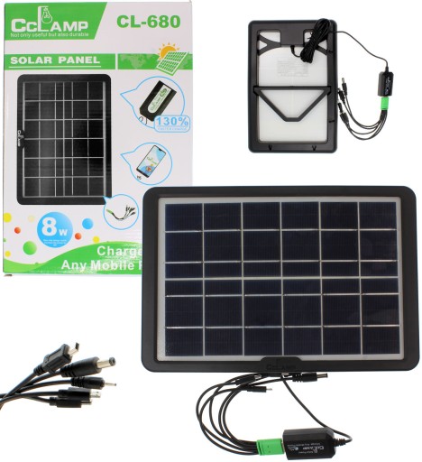 Zestaw przeznaczony do ładowania telefonów, powerbanków, itp dzięki zastosowaniu panelu słonecznego. Bardzo dobrze sprawdzi się w ogrodzie, na działce , kampingu, wycieczce, na łodziach lub wszędzie tam, gdzie zechcemy naładować urządzenie wykorzystując energię słoneczną. Przewód wyprowadzony z panelu zakończony jest gniazdem USB, dodatkowo w zestawie dołączony jest multikabel z 5 końcówkami: USB typ C, miniUSB, microUSB, wtyk 5.5x2.1mm, wtyk 2.35x0.7mm.