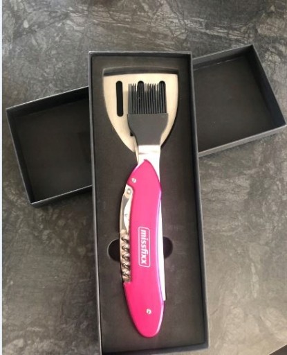 - Multitool składa się z widelca do mięsa, szpatułki, pędzelka do marynaty, otwieracza do butelek, korkociągu i wszystko w intrygującym kolorze różowym.