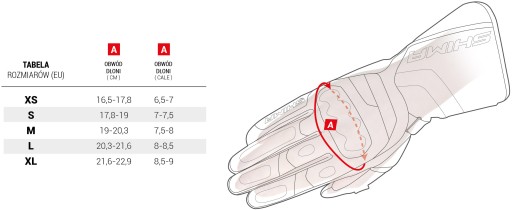 Rękawice damskie o subtelnej linii i wysokim poziomie komfortu. Za ochronę odpowiada ukryty pod wierzchnią warstwą protektor kostkowy, a obszar nadgarstka i boku dłoni został wzmocniony drugą warstwą skóry połączoną z absorberem piankowym. Specjalna konstrukcja damskich modeli rękawic SHIMA uwzględnia anatomię kobiecej dłoni - dłuższe palce, węższy obszar śródręcza oraz smuklejszą dłoń