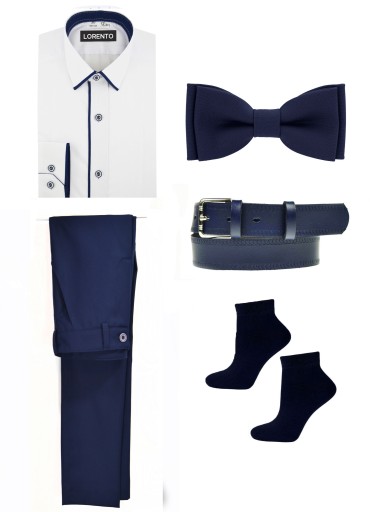 SKŁAD KOMPLETU: spodnie, koszula, muszka, pasek, skarpetki