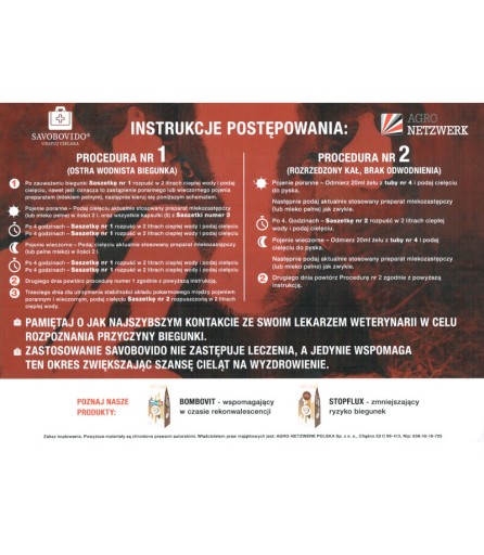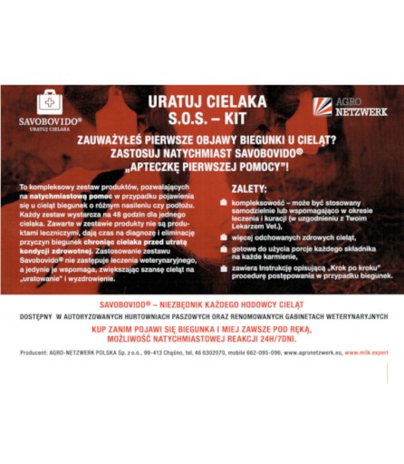 Kompleksowy zestaw produktów, pozwalających na natychmiastową pomoc w przypadku pojawienia się u cieląt biegunek o różnym nasileniu czy podłożu. Każdy zestaw wystarcza na 48. godzin na 1 szt .Zawarte w zestawie nie są produktami leczniczymi, dają czas na diagnozę i eliminację przyczyn biegunek. Zastosowanie zestawu Savobovido® nie zastępuje leczenia weterynaryjnego a jedynie je wspomaga zwiększając szansę cieląt na „uratowanie” i wyzdrowienie.