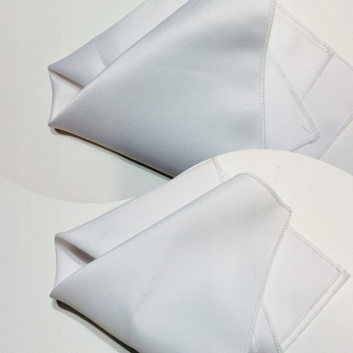 Poszetka po jednej stronie jest matowa, a po drugiej błyszcząca. Brzegi poszetki zostały starannie obszyte. Można ją złożyć w dowolny sposób.