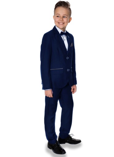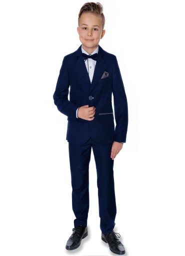 SKŁAD KOMPLETU: marynarka, spodnie, koszula, muszka, poszetka, pasek, skarpetki