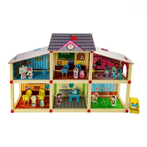 Szkoła - domek dla lalek z akcesoriami. Model posiada łatwą do złożenia plastikową konstrukcję z możliwością dowolnego łączenia. Domek posiada na wyposażeniu drewniane meble, ściany oraz podłogi. Do zestawu dołączone są drewniane figurki.