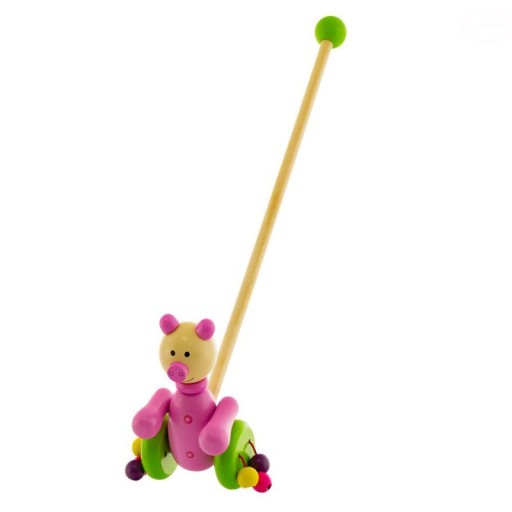 Drewniana zabawka na kółkach typu pchacz. Zabawka posiada piękne żywe kolory oraz kręcące się kółka z koralikami. Zabawka rozwija koordynację wzrokowo ruchową ćwicząc precyzję ruchu.