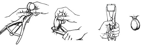 - do zakładania z wykorzystaniem elastratora w okolicy nasady worka mosznowego. Zaciśnięcie gumki powoduje zatrzymanie przepływu krwi do jąder a w konsekwencji ich martwice i zanik
