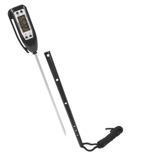 Termometr BROWIN 145709 do żywności. Elektroniczny, bardzo precyzyjny szpilkowy termometr z wyświetlaczem LCD. Doskonale sprawdzający się w gastronomii. Wyposażony w etui, które chroni termometr przed uszkodzeniami mechanicznymi. Termometr posiada możliwość jego zawieszenia w dowolnym miejscu za pomocą sznurka lub przymocowania do paska za pomocą klipsa. Idealny do pomiaru temperatury mięs, potraw, ciast, ciecz itp. Termometr nie może pozostawać w piekarniku w trakcie pieczenia, służy tylko do jednorazowej kontroli temperatury podczas pieczenia.