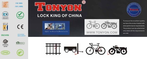 Zamki TONYON posiadają certyfikat ISO9001, firma specjalizuje się w produkcji zamków rowerowych i motocyklowych.