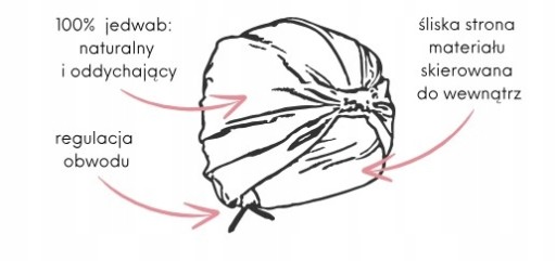 Turban wykonany w 100% z jedwabiu to idealne rozwiązanie do ochrony włosów podczas snu. Jedwabny turban zabezpiecza włosy zapobiegając ich puszeniu, kruszeniu i rozdwajaniu końcówek, jednocześnie wygładzając łuski włosów tym samym poprawiając ich wygląd. Produkty odpowiednie dla prostych lub krótkich włosów.