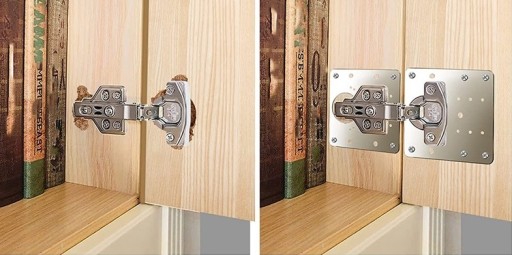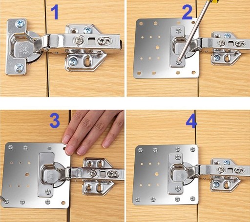 Uniwersalna płytka naprawcza wyrwanego zawiasu meblowego. Dzięki licznym otworom będzie pasował do większości zawiasów i mebli. Produkt jest uniwersalny do lewego jak i prawego zawiasu. Dzięki zastosowaniu płytki z licznymi otworami zawias będzie się trzymał mocniej i pewniej niż fabrycznie.