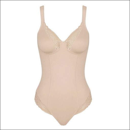 - Modelujące body z miękkimi miskami bez fiszbin ozdobione delikatną, niedrażniącą koronką.