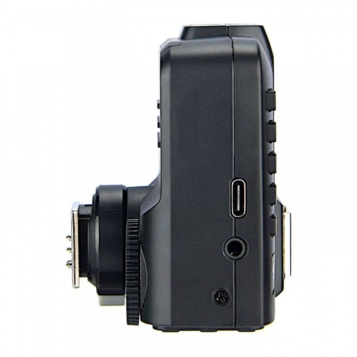 Pokrętło sterujące i niemal wszystkie klawisze zostały ulokowane po lewej stronie obudowy co powoduje, że nie trzeba odrywać prawej ręki trzymającej aparat, aby dokonać zmian w mocy oświetlenia. Na górnym panelu obudowy umieszczona jest stopka służąca do podłączenia nadajnika innego systemu radiowego np. Quadralite Navigator Kit, i używania go jednocześnie z Godoxem X2T . Z przodu obudowy umieszczona jest dioda, której podstawowym zadaniem jest wspomaganie automatycznych systemów ustawiania ostrości, w których wyposażone są aparaty. Przyda się to szczególnie w sytuacjach, gdy sesja odbywa się w warunkach słabego oświetlenia zarówno w studiu jak i poza nim. Podłączenie nadajnika do aparatu zostało udoskonalone i opiera się na stopce wyposażonej w mechanizm blokady, który pozwala na szybkie podpięcie i odpięcie urządzenia. Na bocznym panelu obudowy znajduje się złącze USB typu C, które służy do aktualizacji oprogramowania wewnętrznego oraz port synchronizacji przewodowej, który może zarówno przyjmować jaki wyprowadzać sygnał na zewnątrz. Nadajnik zasilany jest za pomocą dwóch baterii typu AA.