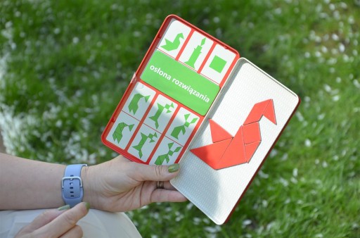 Zasady gry: Zakryj rozwiązania za pomocą magnetycznej tabliczki „Solution cover” i spróbuj odwzorować obrazek na podstawie kształtów jego konturu. Należy wykorzystać wszystkie siedem elementów. Nie mogą na siebie nachodzić. Za pomocą tangramu można ułożyć tysiące obrazków sylwetek ludzi i zwierząt, przedmiotów, figur geometrycznych. Jeśli uda Ci się ułożyć wszystkie figury załączone do zestawu to więcej z łatwością wyszukasz w Google.