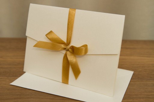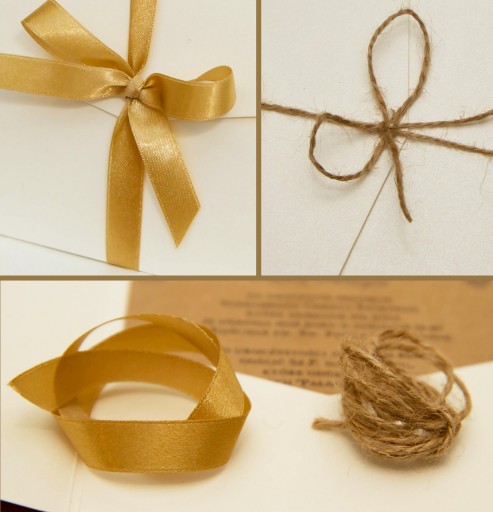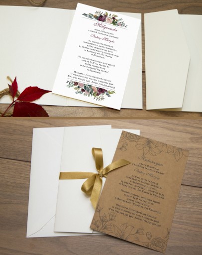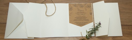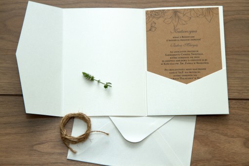 Zaproszenie składa się z 4 elementów: folderu, wkładki, koperty i kokardki lub sznurka jutowego.