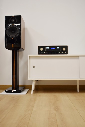 Szafka wyposażona w przesuwana drzwi, które przesuwają się po specjalnych szynach, dzięki temu otwierają i zamykają się się lekko i bezszelestnie. Wnętrze szafki zostało podzielone na dwie równe półki o szerokości 68 cm i głębokości 33 cm. Każda z nich dzielona jest półką na wysokość 14,5 cm, z możliwością regulacji wysokości w zakresie +/- 3 cm. W celu zwiększenie powierzchni użytkowej półkę można całkowicie zdemontować. Szafka wyposażona system zarządzania kablami, w jej tylnej części oraz pomiędzy półkami wykonane zostały wloty na kable, które umożliwiają nam swobodne przekładanie kabli połączeniowych pomiędzy urządzeniami av. W środkowej części blatu wykonane zostało wycięcie do przeprowadzenia kabli telewizora, dzięki któremu szafkę możemy całkowicie dosunąć do ściany.