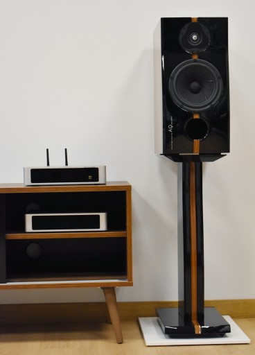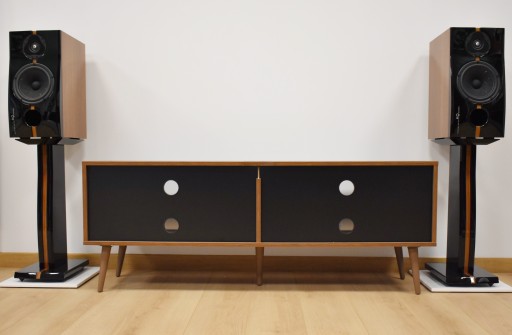 Szafka wyposażona w przesuwana drzwi, które przesuwają się po specjalnych szynach, dzięki temu otwierają i zamykają się się lekko i bezszelestnie. Wnętrze szafki zostało podzielone na dwie równe półki o szerokości 68 cm i głębokości 33 cm. Każda z nich dzielona jest półką na wysokość 14,5 cm, z możliwością regulacji wysokości w zakresie +/- 3 cm. W celu zwiększenie powierzchni użytkowej półkę można całkowicie zdemontować. Szafka wyposażona system zarządzania kablami, w jej tylnej części oraz pomiędzy półkami wykonane zostały wloty na kable, które umożliwiają nam swobodne przekładanie kabli połączeniowych pomiędzy urządzeniami av. W środkowej części blatu wykonane zostało wycięcie do przeprowadzenia kabli telewizora, dzięki któremu szafkę możemy całkowicie dosunąć do ściany.