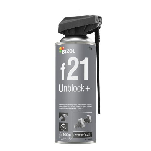 BIZOL Unblock+ f21 to skuteczne narzędzie do odkręcania zardzewiałych części. Posiada doskonałe właściwości penetrujące, zawiera grafit i MoS2, jest odporny na wilgoć i zapobiega rdzy. Posiada wydajny nowy strumień Cobra, który przy odpowiednim dozowaniu szczególnie skutecznie dociera do trudno dostępnych miejsc.