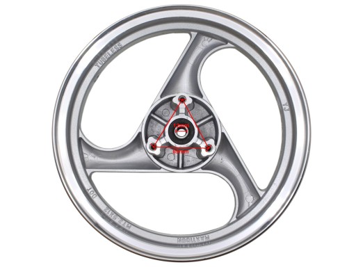 Felga 12 cali przednia pasująca do skutera GY6-502,5 X 12 osadzana na sworzeń średnicy 12mm (średnica wewnętrzna łożyska). Felgaposiada wypust do linki prędkościomierza.