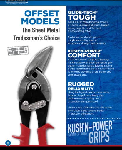 „Przesunięcie” określa, że podczas cięcia blachy stalowej metal zostanie odsunięty lub „przesunięty” od narzędzia i rąk użytkownika, co zapewnia płynniejsze i bezpieczniejsze cięcie. Ta cecha nożyc MidWest Offset umożliwia użytkownikowi cięcie od początku do końca bez konieczności ponownej regulacji arkusza blachy; i sprawia, że cięcie jest płynniejsze, łatwiejsze i szybsze.