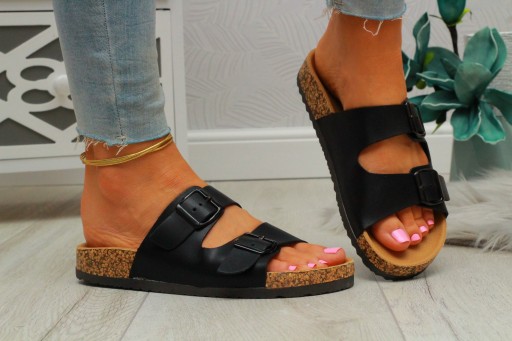 Damskie klapki casual na dwie klamry w kolorze czarnym. Sprawdzą się idealnie jako obuwie na co dzień. Będą odpowiednie na ciepłe, wiosenne i letnie, upalne dni. Pasują do wielu stylizacji. Płaska, korkowa podeszwa oraz profilowana wkładka zapewniają komfort i wygodę użytkowania.