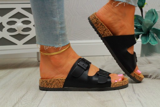 Damskie klapki casual na dwie klamry w kolorze czarnym. Sprawdzą się idealnie jako obuwie na co dzień. Będą odpowiednie na ciepłe, wiosenne i letnie, upalne dni. Pasują do wielu stylizacji. Płaska, korkowa podeszwa oraz profilowana wkładka zapewniają komfort i wygodę użytkowania.