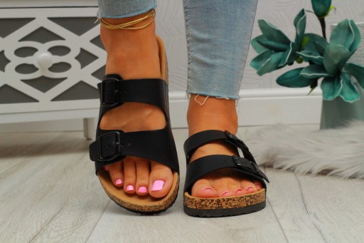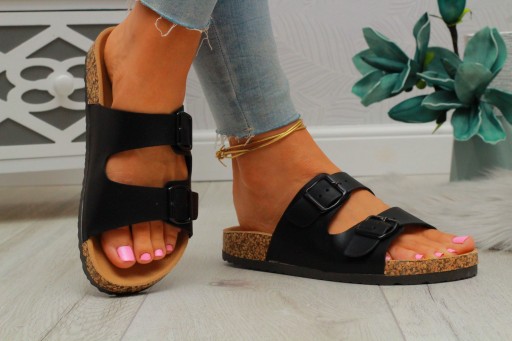 Damskie klapki casual na dwie klamry w kolorze czarnym. Sprawdzą się idealnie jako obuwie na co dzień. Będą odpowiednie na ciepłe, wiosenne i letnie, upalne dni. Pasują do wielu stylizacji. Płaska, korkowa podeszwa oraz profilowana wkładka zapewniają komfort i wygodę użytkowania.