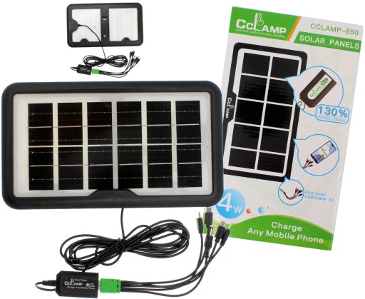 Zestaw przeznaczony do ładowania telefonów, powerbanków, itp dzięki zastosowaniu panelu słonecznego. Bardzo dobrze sprawdzi się w ogrodzie, na działce , kampingu, wycieczce, na łodziach lub wszędzie tam, gdzie zechcemy naładować urządzenie wykorzystując energię słoneczną. Przewód wyprowadzony z panelu zakończony jest gniazdem USB, dodatkowo w zestawie dołączony jest multikabel z 5 końcówkami: USB typ C, miniUSB, microUSB, wtyk 5.5x2.1mm, wtyk 2.35x0.7mm.