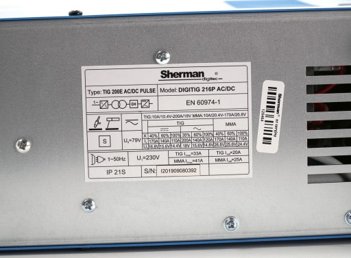 Producent: Sherman|| Metody spawania: TIG AC, TIG DC, MMA || Zasilanie: 230V || Maksymalny prąd spawania: 200A || Cykl pracy: 35% ||
