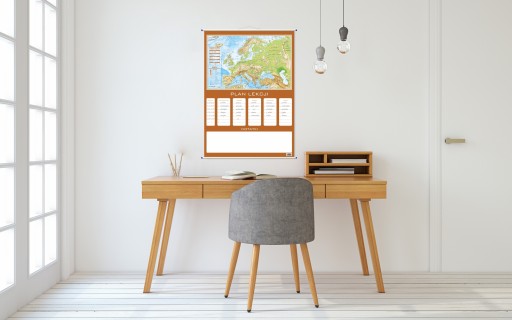 Plan lekcji to narzędzie dla uczniów i rodziców, bez którego trudno zapanować nad czasem i organizacją tygodnia rodziny w roku szkolnym. Tablica do zawieszenia nad biurkiem pomoże spokojnie rozpocząć naukę pierwszoklasistom, jak i uczniom klas starszych. Dziecko pakując książki na kolejny dzień szkolny niemal intuicyjnie będzie odkrywać Europę fizyczną.