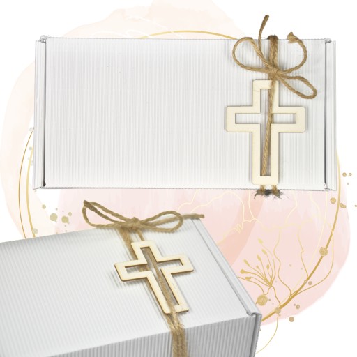 - Pudełko prezentowe z białej karbowanej tektury wypełnione wełną drzewną 23 x 11,5 x 9 cm, przewiązane emblematem