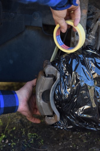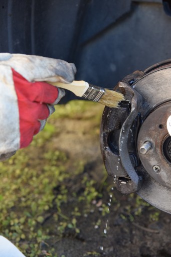 - Nanieść 2-3 warstwy w odstępach 15-30 min w zależności od temperatury (lakier powinien być lekko klejący ale już nie brudzący). Nie dopuszczać do zamalowania lakierem elementów ciernych, przewodów oraz części ruchomych hamulca.