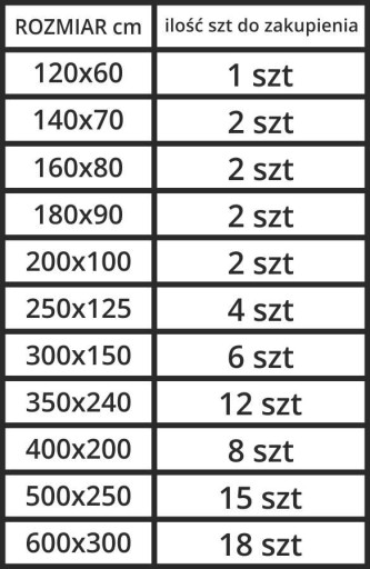 Tło możemy wykonać w dowolnym wymiarze, obok przedstawiamy najczęściej zamawiane wymiary oraz ilość sztuk którą należy zakupić.