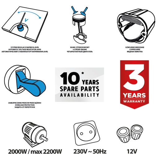 Spełnia normy EURO V i ma wbudowany system AVR, efektywnie stabilizujący napięcie w gnieździe wyjściowym, a także zabezpieczenie nadmiarowo-prądowe.