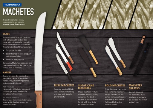 Powszechnie znana ze swoich doskonałych produktów w ciągu ostatnich 100 lat produkcji, Tramontina produkuje wysokiej jakości maczety, począwszy od maczet typu Bush i Bolo aż do maczet przeznaczonych do trzciny cukrowej. Maczety Tramontina są jednym z najczęściej używanych narzędzi rolniczych w Ameryce Południowej i na wyspach Pacyfiku.